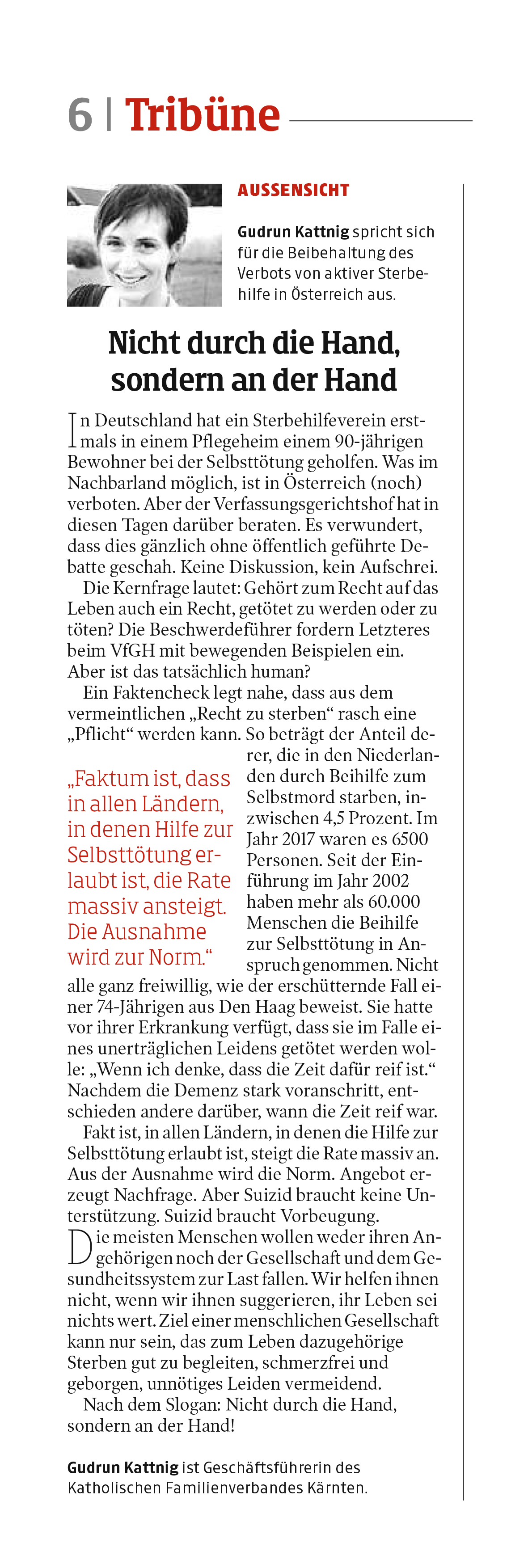 Was im Nachbarland möglich, ist in Österreich (noch) verboten. Aber der Verfassungsgerichtshof berät in diesen Tagen darüber. Es verwundert, dass dies gänzlich ohne öffentlich geführte Debatte geschieht. Keine Diskussion, kein Aufschrei.