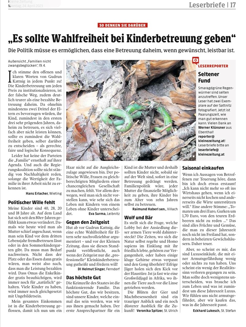 Klagenfurt 1. März 2023 (OTS) - Das ergab eine aktuelle Abstimmung des Katholische Familienverbandes Kärnten zur Wahlfreiheit in der Kleinkindbetreuung.